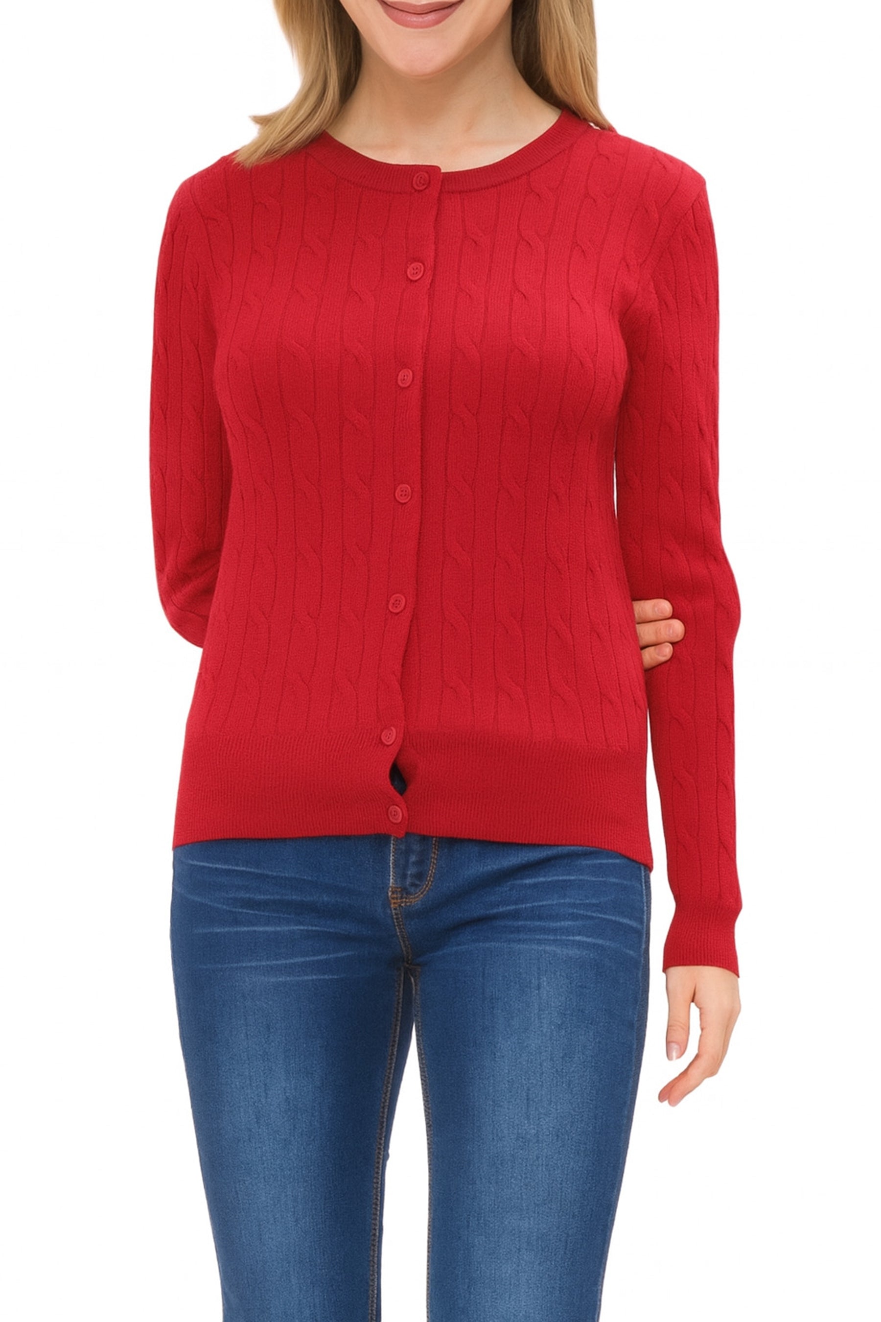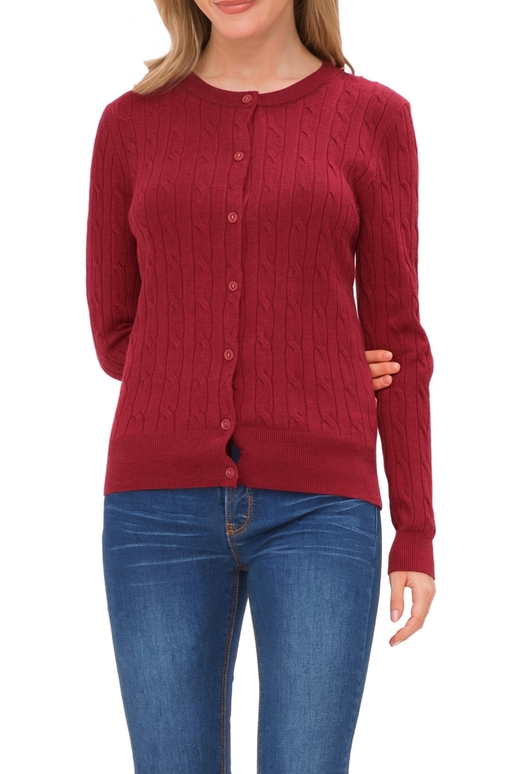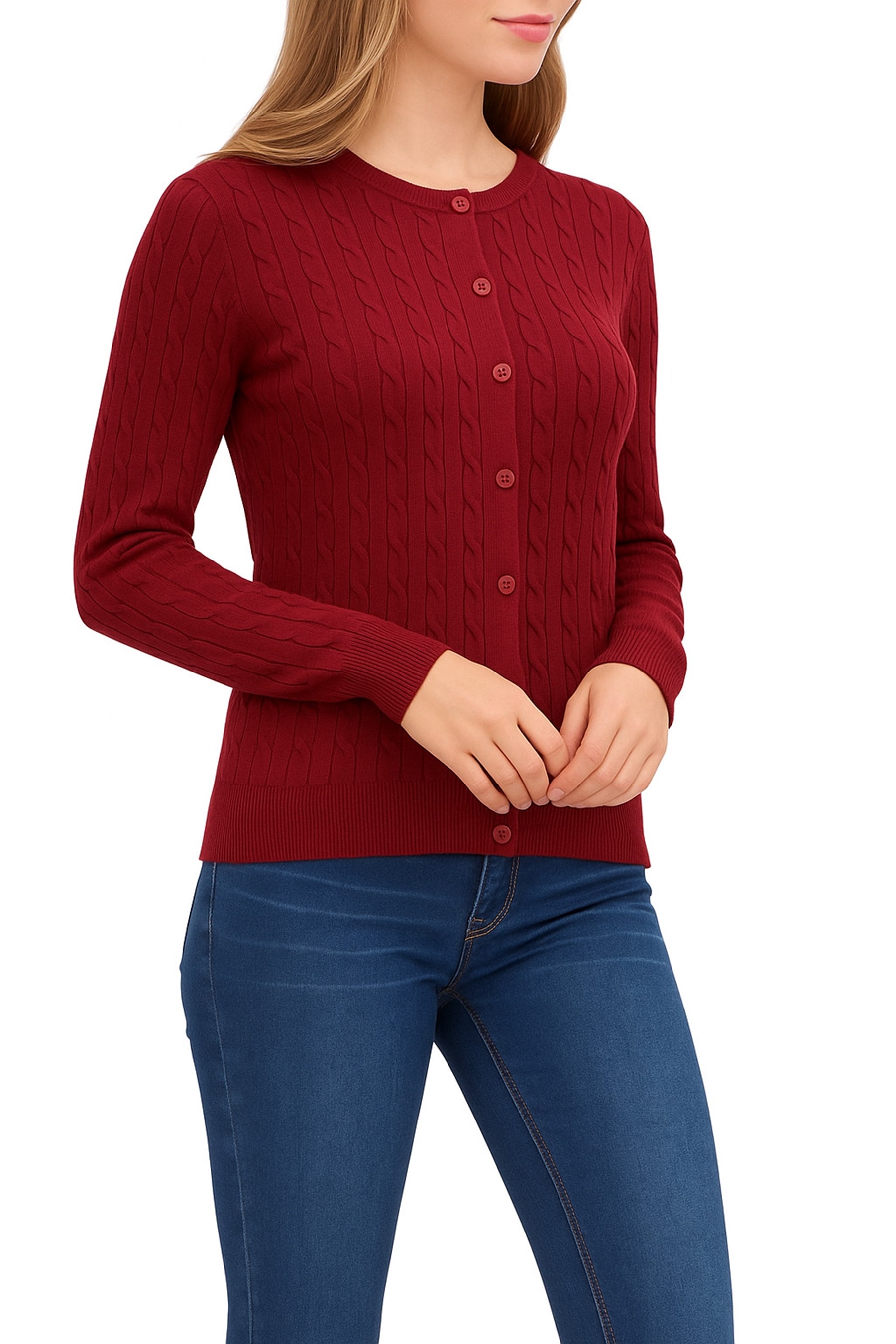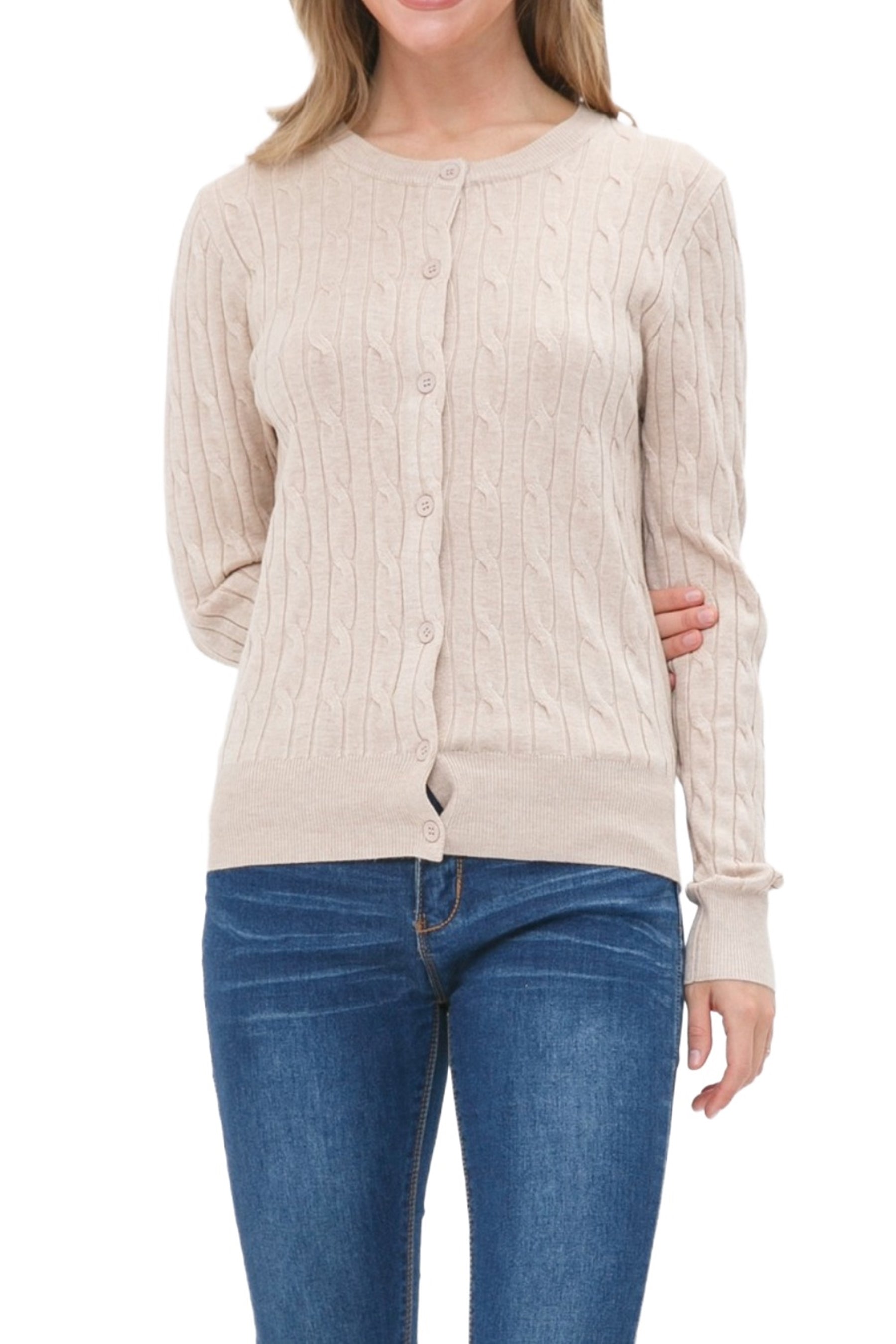 The Women’s Crew Neck Cable Knit Button Cardigan blends sophistication, comfort, and timeless style. Crafted from a soft and durable 70% viscose and 30% nylon blend, this cardigan offers a luxurious feel with excellent shape retention.The cable knit design adds elegant texture, while shank buttons elevate the look with a touch of refinement. Ribbed cuffs, hem, and neckline ensure a perfect fit and polished finish. Whether layered over a blouse for work or paired with jeans for casual outings, this cardigan delivers warmth, versatility, and enduring style.Available in multiple neck and sleeve styles—including crew neck, V-neck, button-up, and pullover—this wardrobe staple is perfect for any season or occasion.